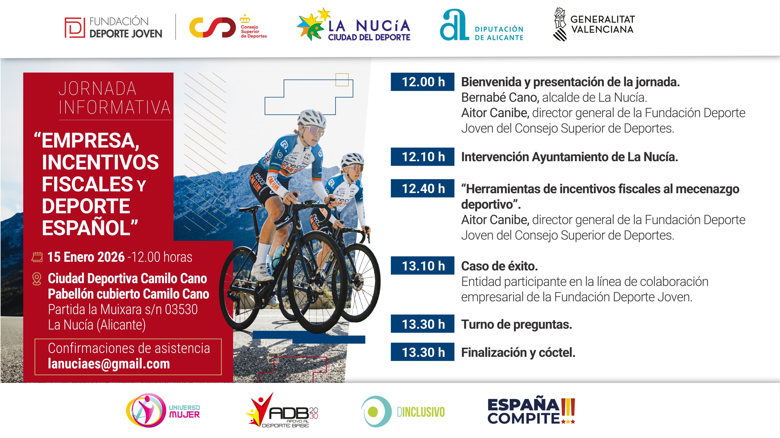 Esta jornada informativa est organizada por Fundación Deporte Joven del Consejo Superior de Deportes y la concejalía de Deportes de La Nucía, con la colaboración de Universo Mujer, ADB 2023 (Apoyo al Deporte Base), DInclusivo, Diputación de Alicante, Generalitat Valenciana y España Compite.
